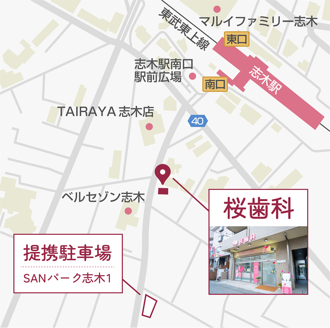 志木駅から徒歩2分。通勤や通学の途中にも立ち寄りやすく、土曜診療も行っているため、お仕事や学校帰りにも通いやすい歯科クリニックです。最新の医療設備を備え、精密な診断と、なるべく痛みを抑えた負担の少ない治療を心がけています。虫歯や歯周病の治療はもちろん、予防や審美など幅広く対応。安心して通える地域のかかりつけ医をお探しの方は、ぜひ当院へご相談ください。